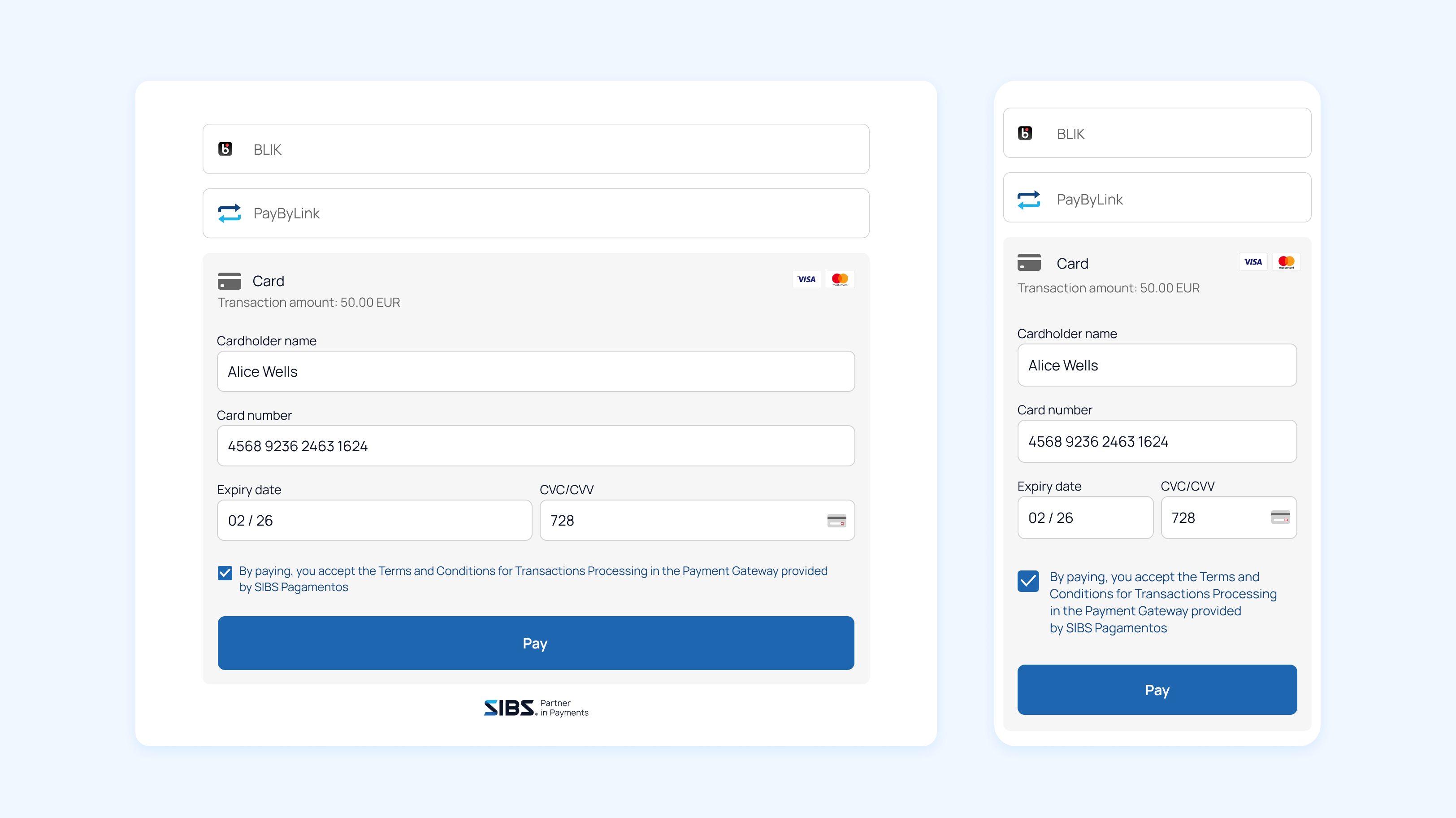 Because the payment form is hosted by SIBS and embedded using an iframe, all customer payment data is captured and processed directly within SIBS infrastructure. This means that sensitive data never passes through the merchant’s environment.
