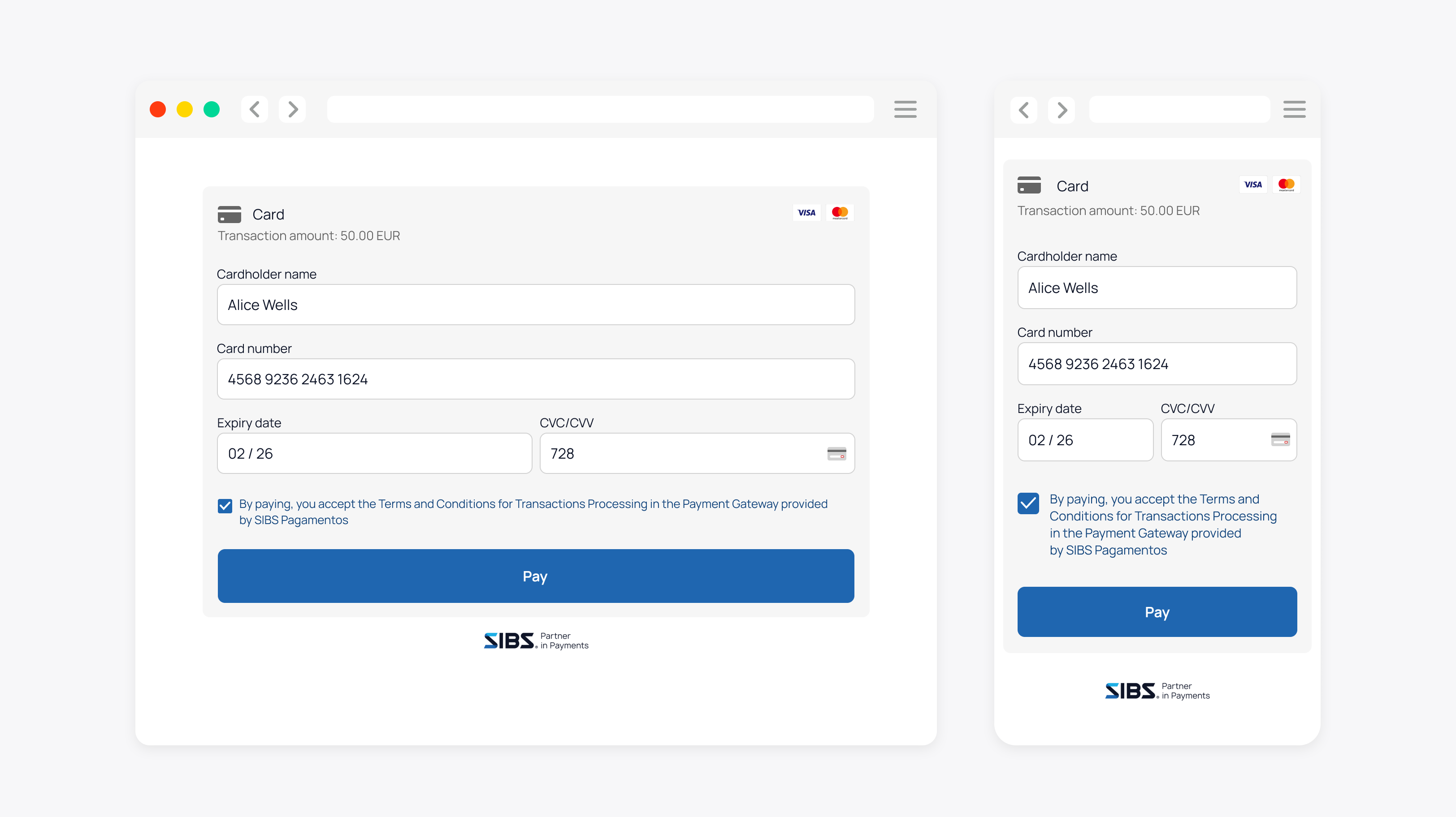 | PROD | api.sibsgateway.com | POST version-id/{id}/card/purchase | Requests the payment registered by the previous checkout using card details inserted by the customer. |