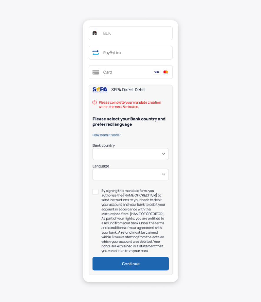 After selecting SEPA Direct Debit at checkout, the user will be asked to choose their bank’s country and preferred language. This ensures the bank selection list is localized and relevant to their region.