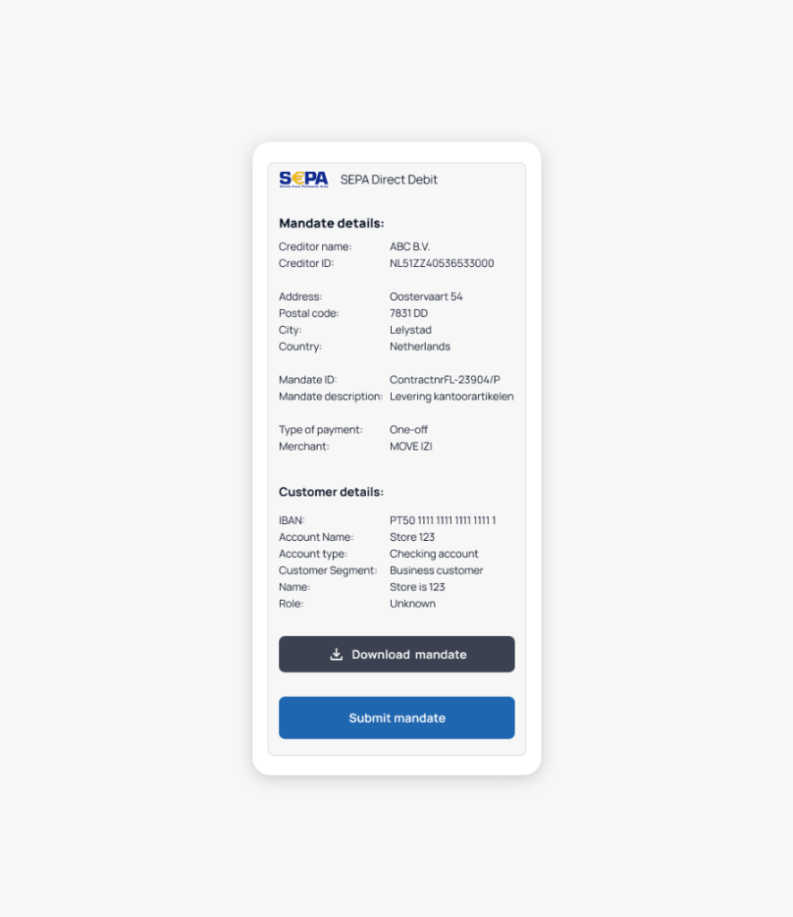 A PDF file of the mandate is automatically generated from the verified account data. A “Download mandate” button is available on the mandate details page so the user can save a copy to their device as proof of creation. The user can then click on “Submit mandate” to finish the mandate creation flow.