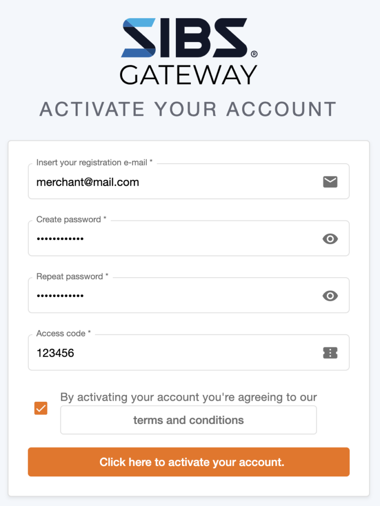 Upon completing the onboarding process, you will receive credentials that include an email and an activation code. You will need these credentials to register your access on the SIBS Backoffice.
