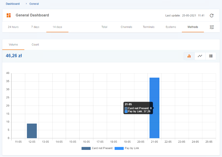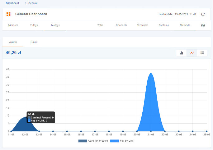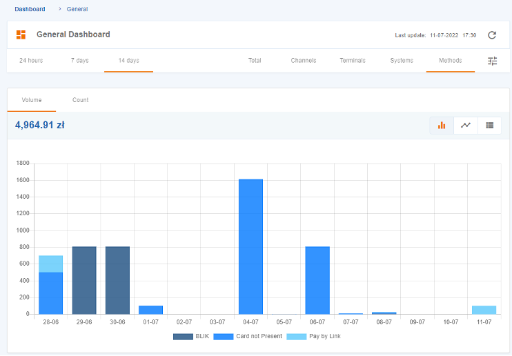 The “Dashboard” feature enables the filtering of data for default time periods of “24 hours”, “7 days”, or “14 days”, and also allows for the visualization of transaction data, which can be displayed as totalized amount (“Total”) or aggregated into categories such as “Channels”, “Terminals”, “Systems”, and “Methods”.