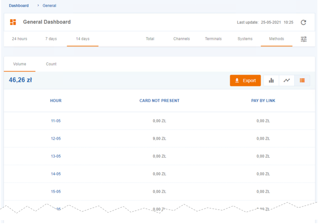 The Methods are the payment instruments (examples: Cards Pay by Link, BLIK, Paypal, Apple Pay). At most seven different Methods are shown, being that lesser relevant payment methods are aggregated under the “Others” category.