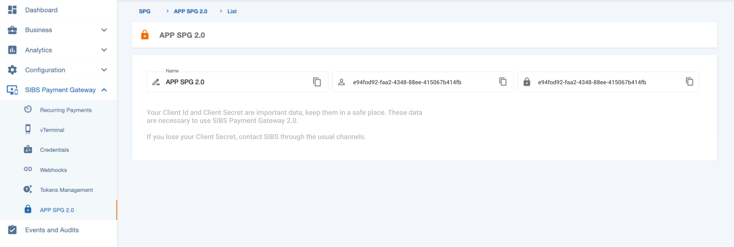 The technical information necessary to invoke SIBS Gateway APIs can be found in the “APP SPG 2.0” menu. Here, the API Client ID and Client Secret can be obtained by clicking the “Get” button and verifying with a password. It’s essential to keep this information secure and include it as the value of the corresponding HTTP Header fields in each API call. To copy the values, simply click the copy button.
