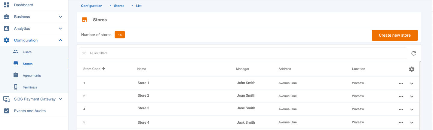 The Merchant’s store list, which can be filtered through a quick search based on properties such as code, name, manager, address, and location; with the option to view store details, edit stores and save changes, or delete stores.