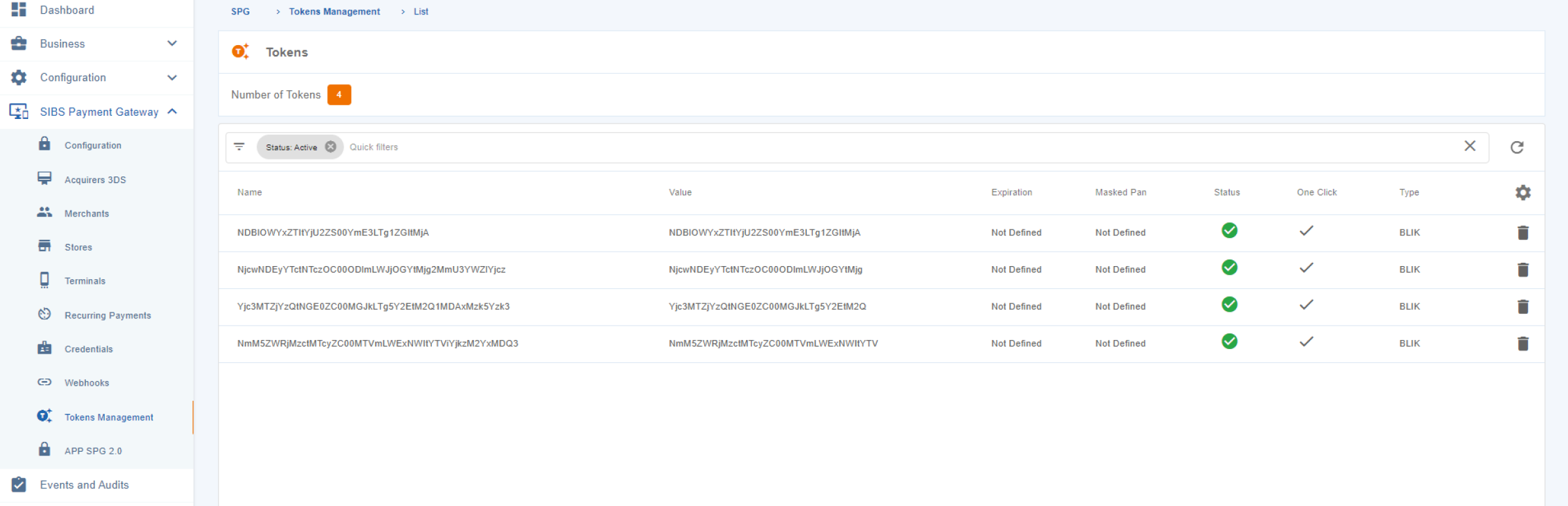 The “Tokens management” menu provides you with a list of your stored card tokens. You can apply quick filters by Name, Value, Masked PAN, and Status to easily find the token you need.