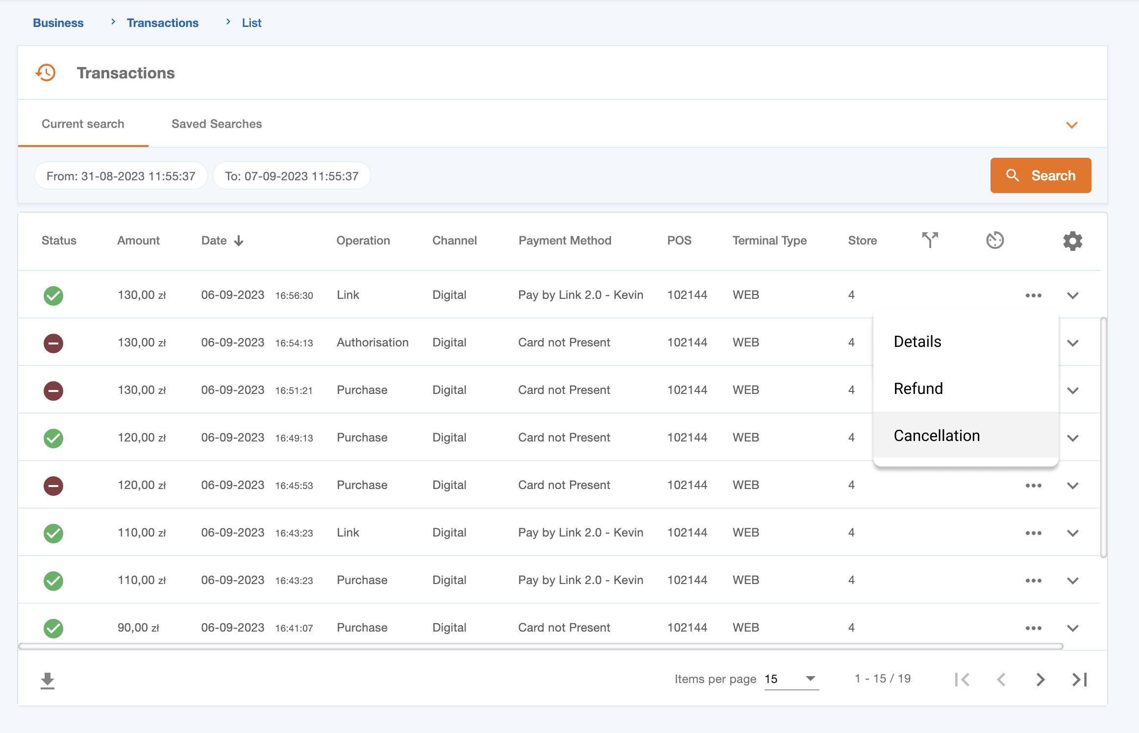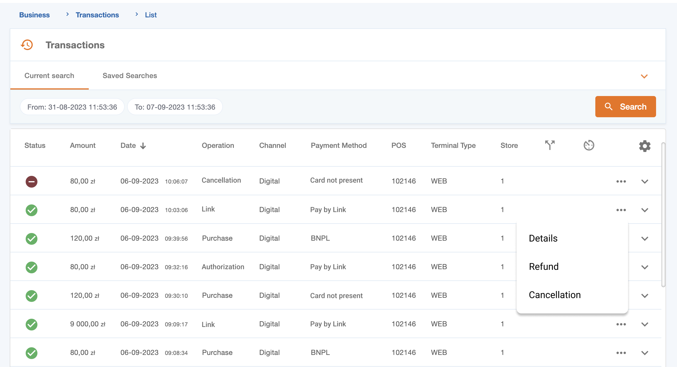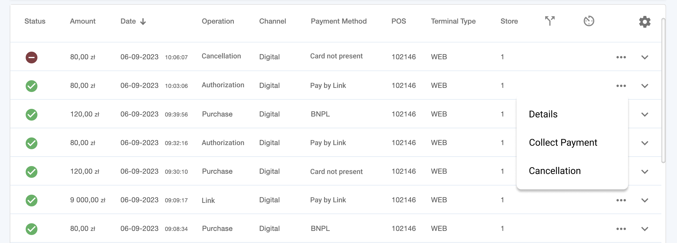 You can view all your recent payments and you can filter them. Information displayed for each payment includes transaction status, payment amount, date of the transaction, type of operation, the channel, payment method, the POS terminal and the store code.
