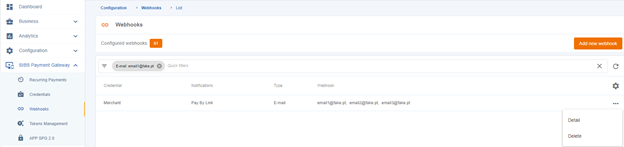 In the “Webhooks” menu, you can view a list of all your webhooks. You can quickly apply filters by credential, notifications, type, and webhook (email or URL).