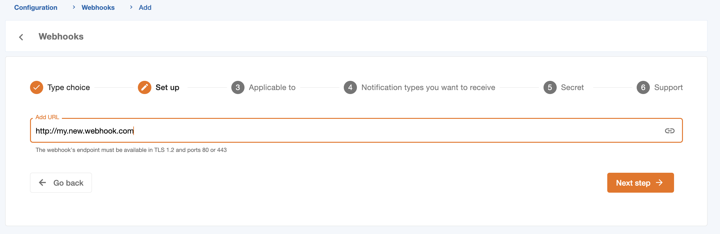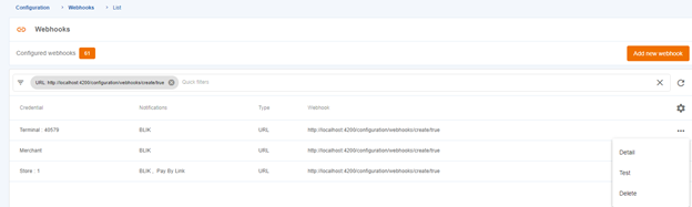 To create a new webhook, you need to click on the “Add new webhook” button. Then, a set of steps will be presented to guide you in filling in the necessary data to create a webhook. The following images show an example of creating a URL-type webhook.