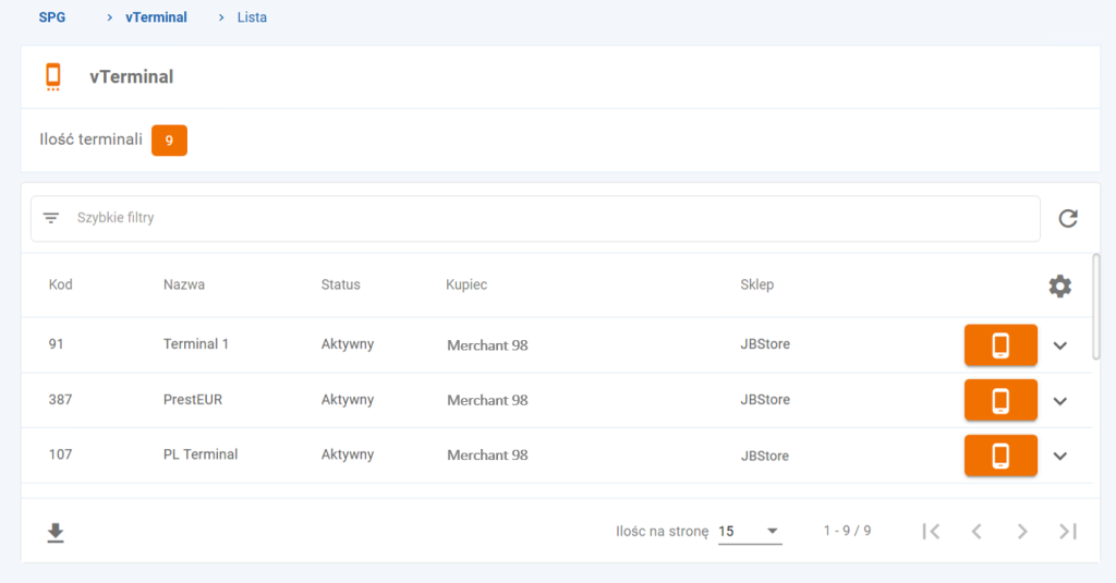 Skorzystaj z paska szybkich filtrów , aby wyszukać dostępne terminale według jednego z poniższych pól: