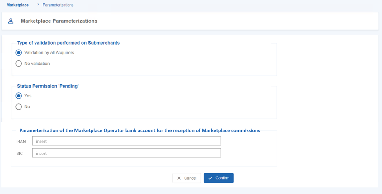 In this submenu, the Marketplace Operator must also define the IBAN and BIC of the bank account where they wish to receive their Marketplace fees.