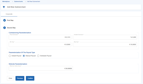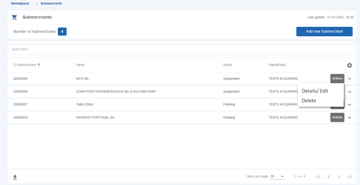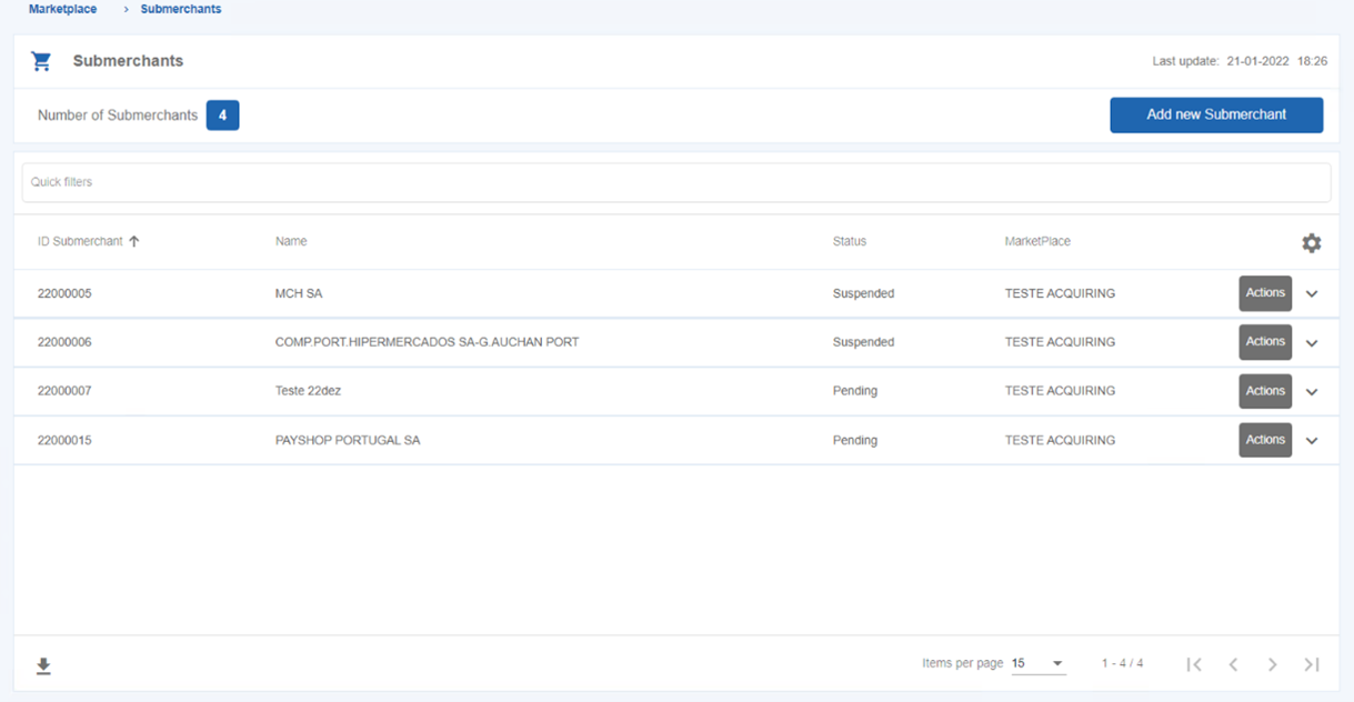 Through the “Submerchants” submenu, the Marketplace Operator can list Submerchants registered in the Marketplace, register new Submerchants or view details of a Submerchant registered in the solution.