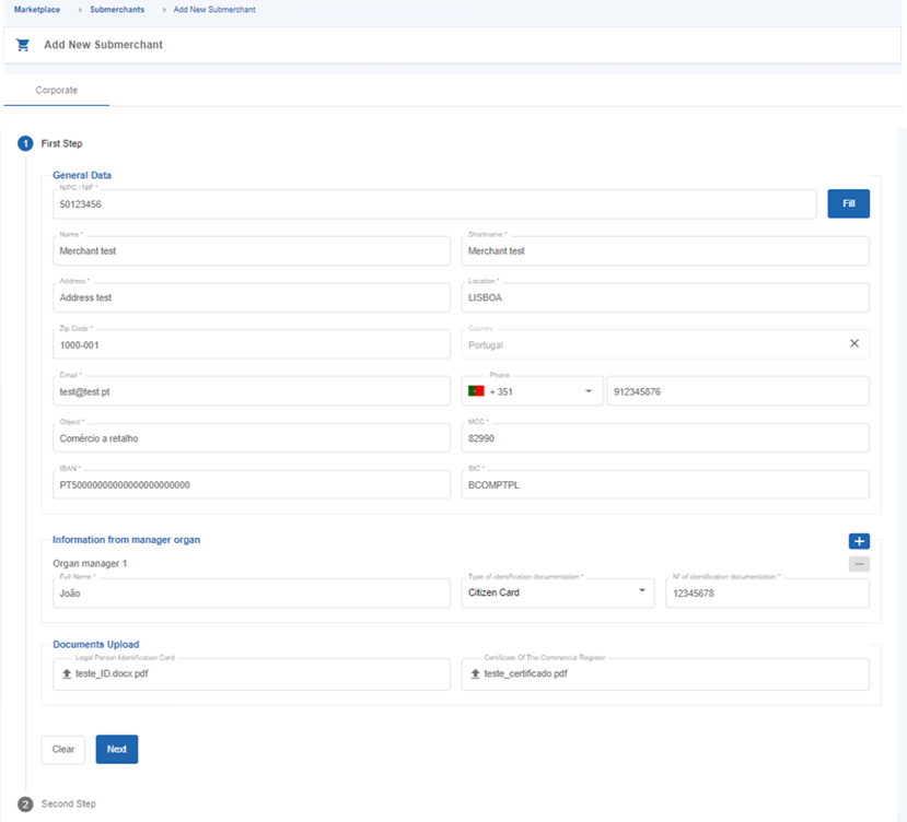 The registration of Submerchants can be done in SIBS Backoffice. This feature can be performed by the Marketplace Operator by clicking on the “Add new Submerchant” button on the top right hand corner of the figure above. By clicking on that button, the screen below will be displayed.