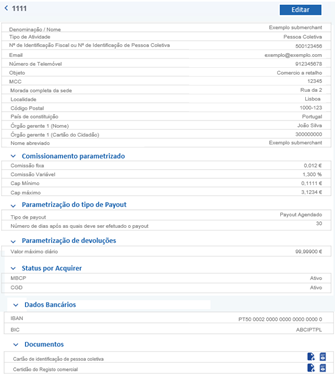 On the ellipsis button (“…”) associated to a certain Submerchant, on selecting the “Details/Edit” option, the User is directed to a page displaying all the information of a specific Submerchant.