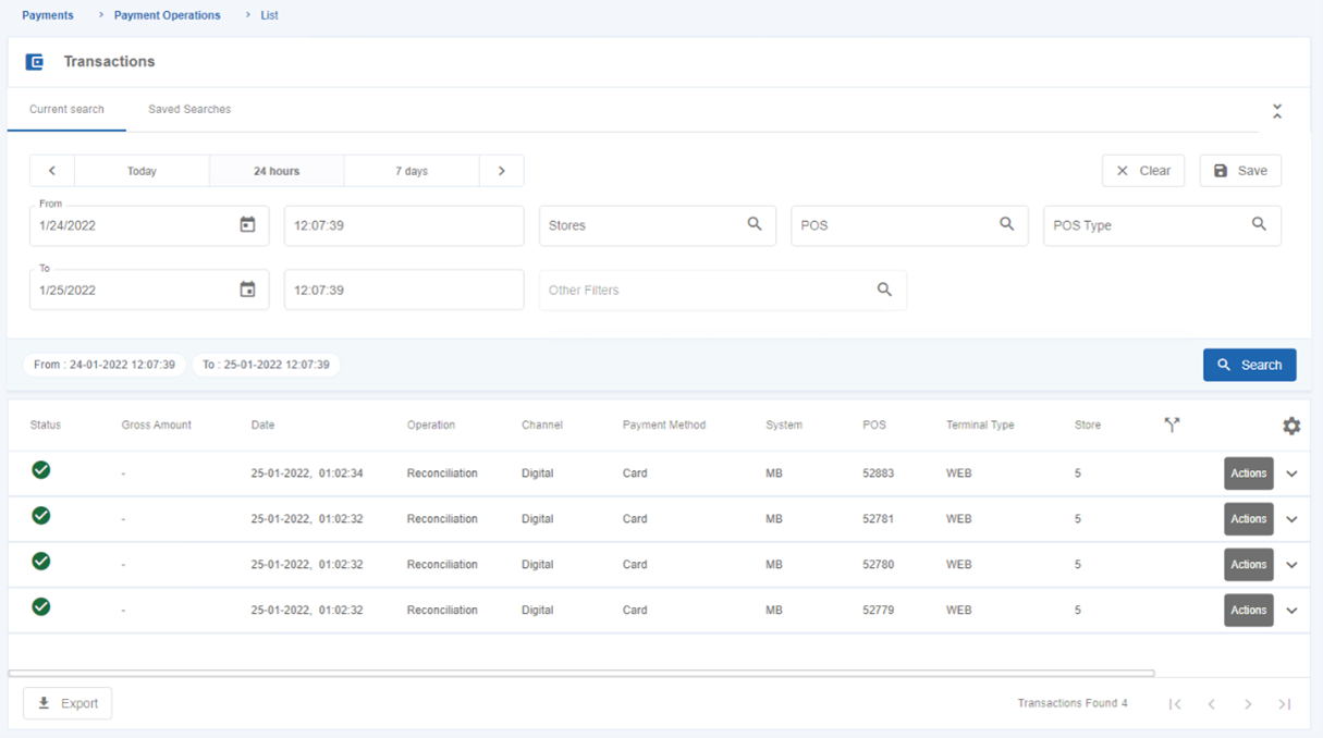 The transactions processed in the Marketplace solution are presented in SIBS Backoffice in the same listing as the Merchant’s operations in the other channels. In this way, the Merchant has an aggregated view of all his transactions across all his channels and businesses. The User can identify the operations processed in the Marketplace solution through the “Terminal Type” field visible in the following figure.