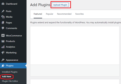 3. Log into your WordPress administration area (default at https://yourwebsite/wp-admin/) and go to Plugins in the side menu > Add New > Upload Plugin: