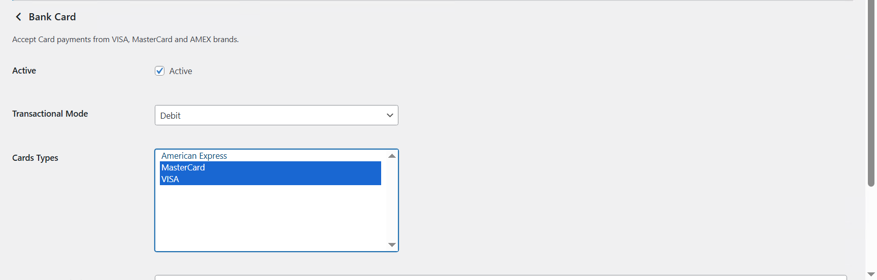 Besides being able to activate or de-activate this payment method, in the SIBS Cards configuration you can select which card types you accept and will be displayed in the checkout page: