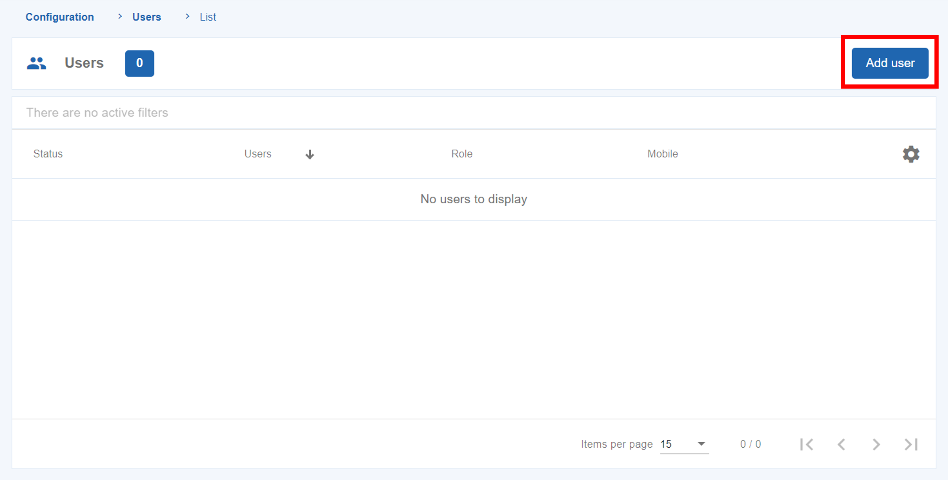 To register a new user into SIBS Backoffice go to “Configuration” > “Users”. In that page click on the “Add user” button.