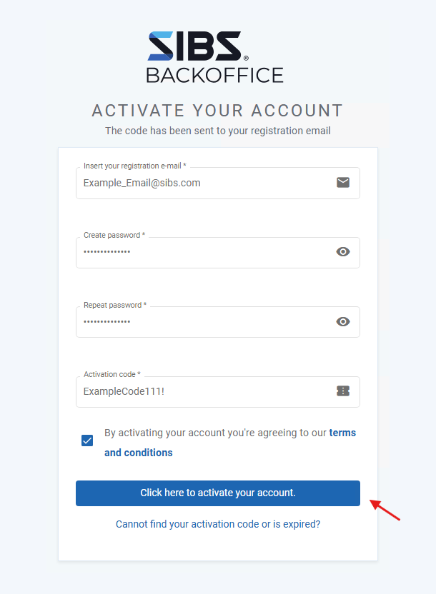After submitting the form, you will receive a new email with the activation code needed to complete your registration on the SIBS Backoffice.