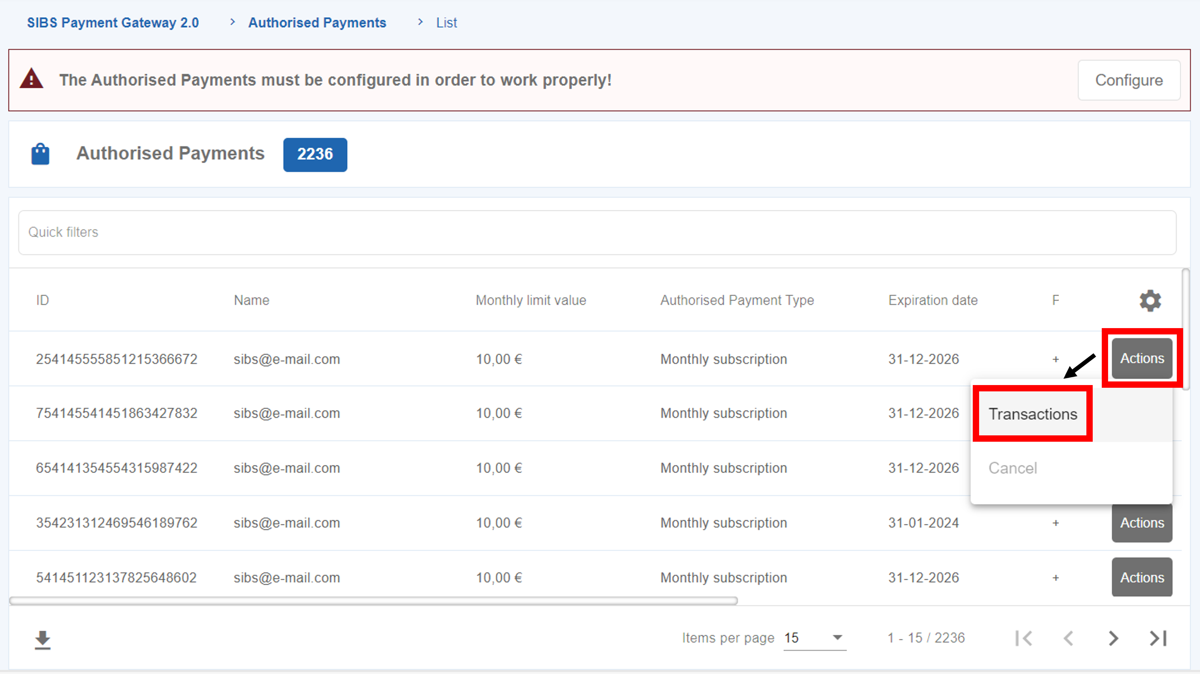 To check the transactions associated to a given Authorised Payment, click on the “Actions” button and then on the “Transactions” option, as shown below.
