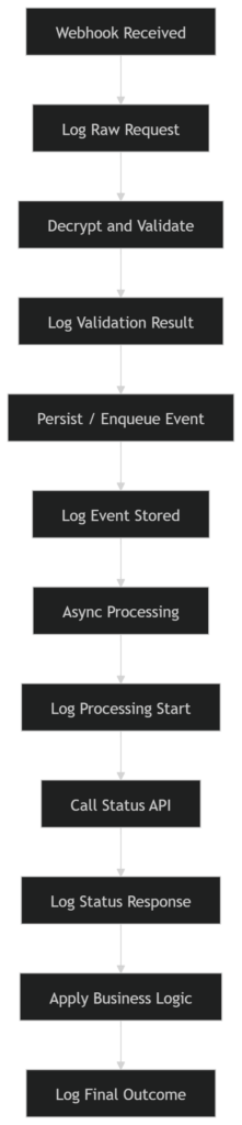 A production-ready implementation must provide full observability across the webhook lifecycle, from reception to final business processing, including interactions with the Status API.