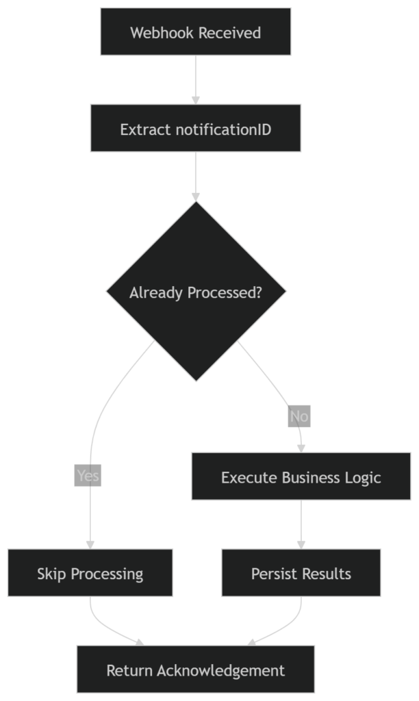 Webhook processing must therefore be designed under the assumption that any notification may be delivered more than once.