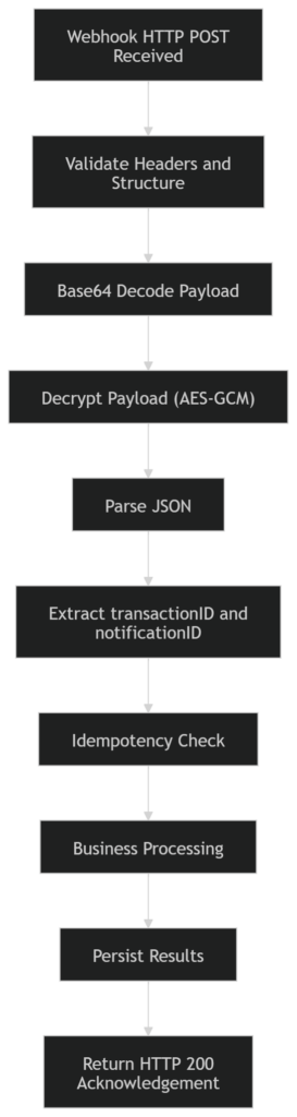Webhook delivery, encryption model, and required headers are defined in the E.1 Webhooks (Notifications) section. The objective here is to demonstrate how those specifications are applied in a real processing pipeline, ensuring correctness under asynchronous and non-deterministic conditions.