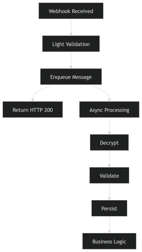 Webhook handling must be implemented as a structured and controlled process, where each step is explicitly defined and validated, rather than as a single-step operation.
